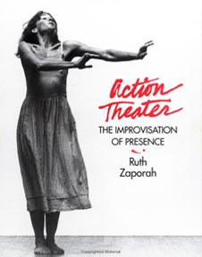 | Zap Performance Projects is pleased to announce the publication of Ruth Zaporah's ACTION THEATER: THE IMPROVISATION OF PRESENCE, published by North Atlantic Books in Berkeley, California. Ruth Zaporah is an internationally renown teacher and innovator of Action Theater, an improvisational form that unites movement and acting into congruent expression. For over 25 years, Zaporah has trained people in Europe and the United States -- actors, dancers, musicians, and all who explore the relationship between mind, body, action and performance. | Packed with over 100 skill-building exercises and illustrative photographs, ACTION THEATER: THE IMPROVISATION OF PRESENCE is an indispensable training manual. This exciting new book examines the process of improvisation as it outlines one of Zaporah's intensive twenty-day training programs. Her writing, clear and articulate, fills each chapter with detailed discussions, anecdotes and examples of the inner process of improvisation based on embodied awareness. |